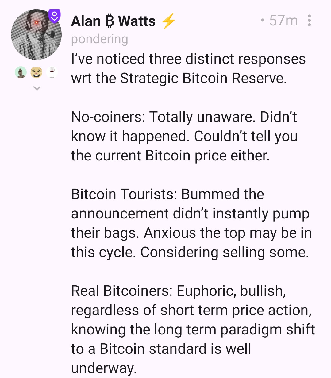 After long being skeptical (which is fair enough, as everyone should and does start that way with Bitcoin), credit where it's due for embracing Bitcoin! He clearly doesn’t fully get it yet, it’s frustrating that he's creating scammy meme coins and doesn’t understand the difference between Bitcoin and crypto yet but his announcement of a Strategic Reserve is a step in the right direction. ⬇️